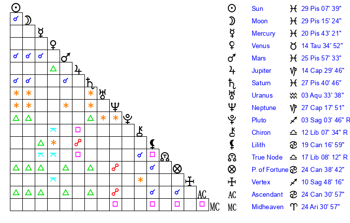 Sun | 29 Pisces 7 | 29 Pisces 5 | 27 Aries 42 |