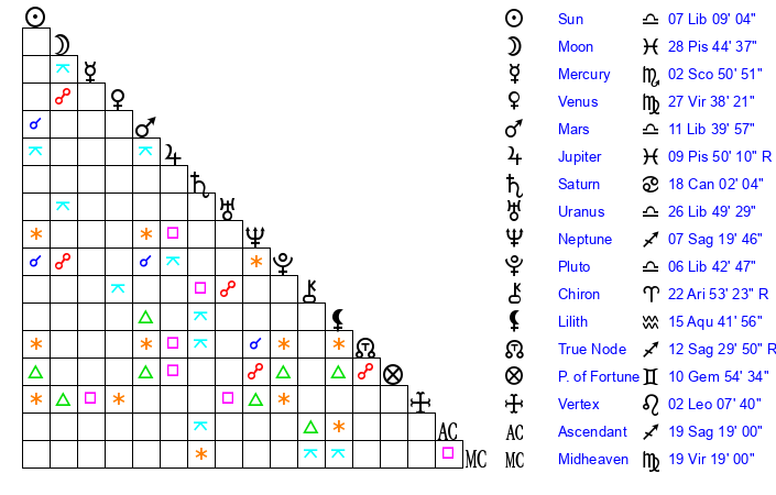 | Neptune | 7 Sagittarius 19 | 0 Aries 32 | 8 Sagittarius 54 |