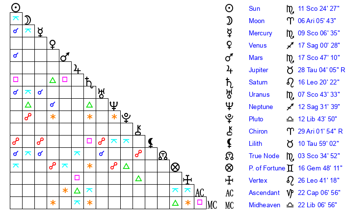 | Sun | 11 Scorpio 24 | 11 Scorpio 31 | 0 Capricorn 59 |