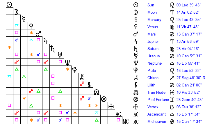 | Pluto | 18 Leo 53 | 2 Aquarius 36 | 21 Leo 0 |