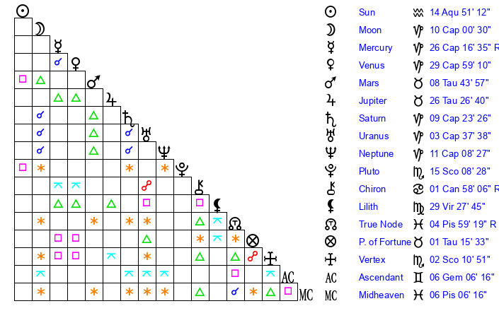 | Mercury | 26 Capricorn 16 | 10 Aquarius 56 | 1 Pisces 29 |
