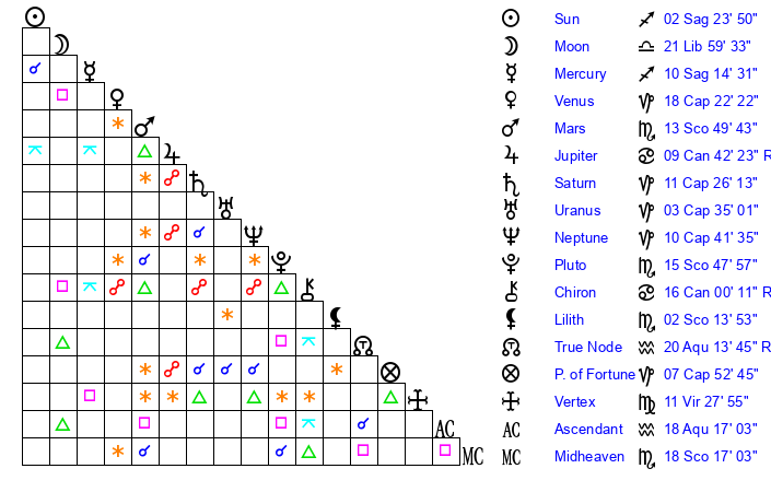 | Mars | 13 Scorpio 50 | 14 Sagittarius 39 | 8 Sagittarius 45 |