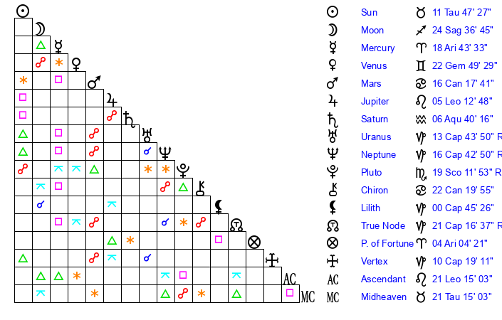 | Moon | 24 Sagittarius 31 | 19 Cancer 42 | 15 Pisces 0 |