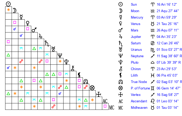 | Sun | 16 Aries 16 | 17 Aries 8 | 4 Gemini 49 |