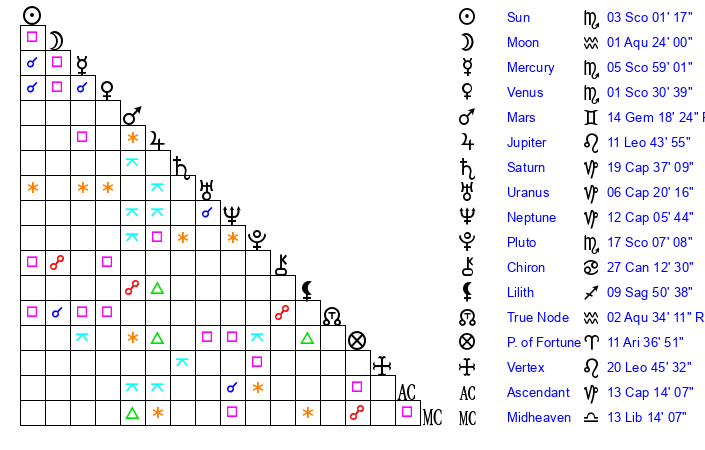 | Pluto | 17 Scorpio 7 | 1 Aquarius 24 | 18 Scorpio 31 |