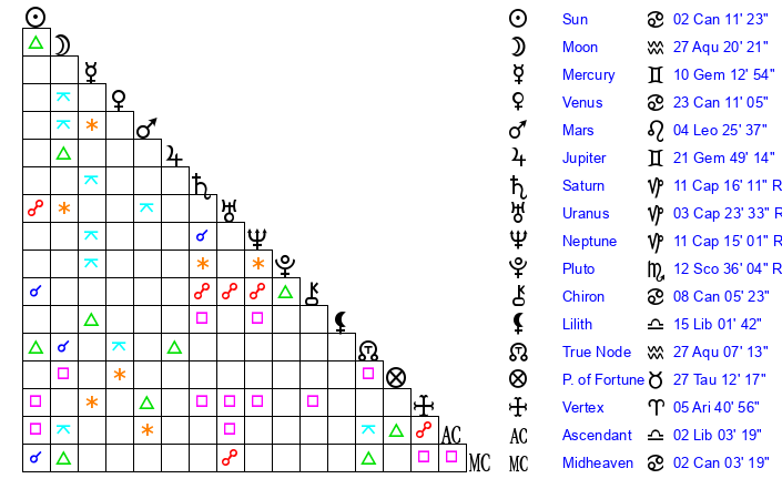 | Moon | 27 Aquarius 20 | 8 Gemini 40 | 0 Cancer 6 |