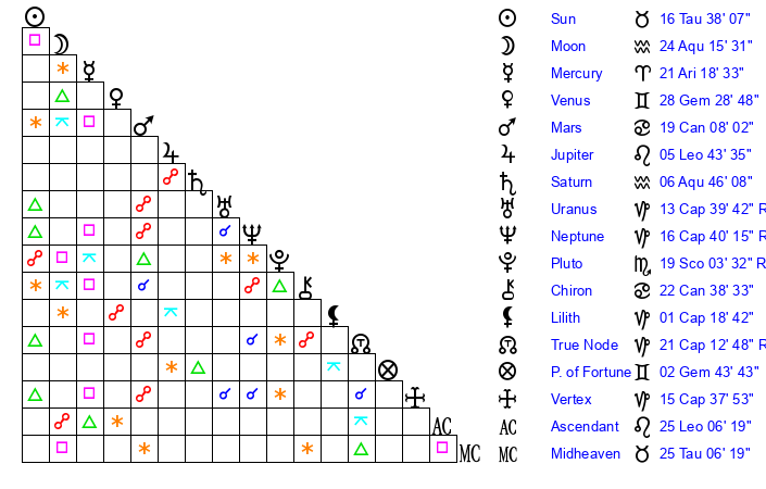 | Sun | 16 Taurus 38 | 17 Taurus 23 | 19 Gemini 19 |