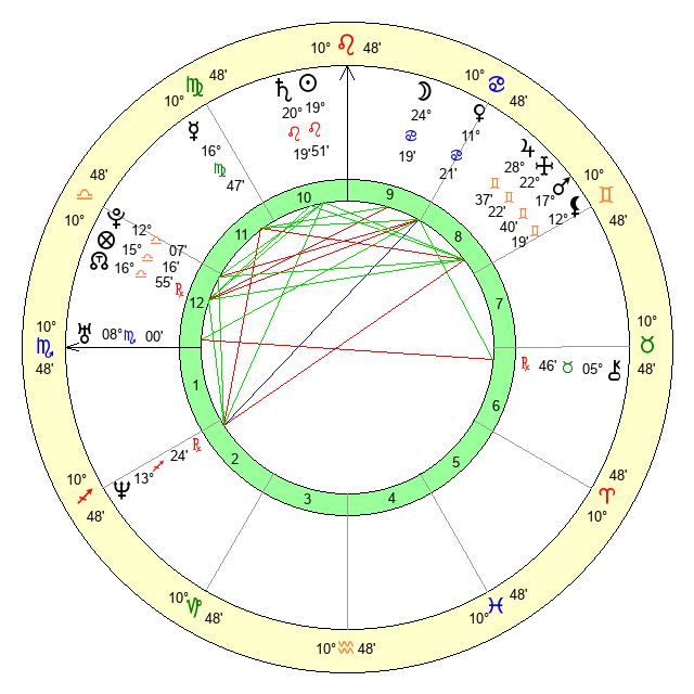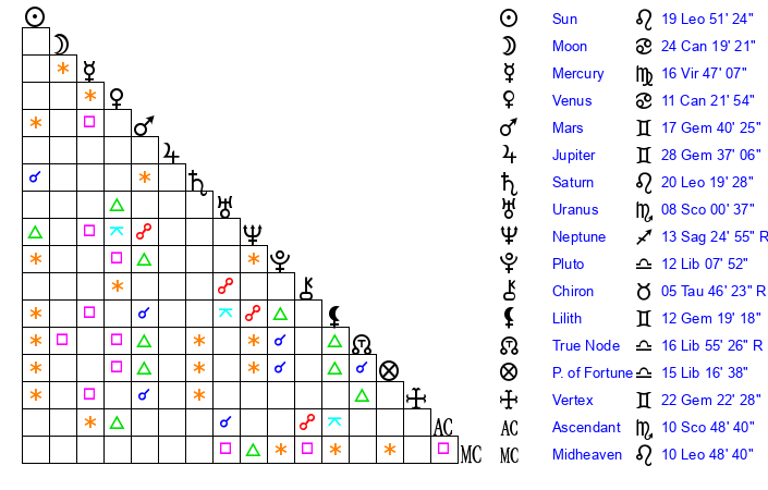 | Mercury | 16 Virgo 47 | 4 Leo 21 | 21 Virgo 57 |