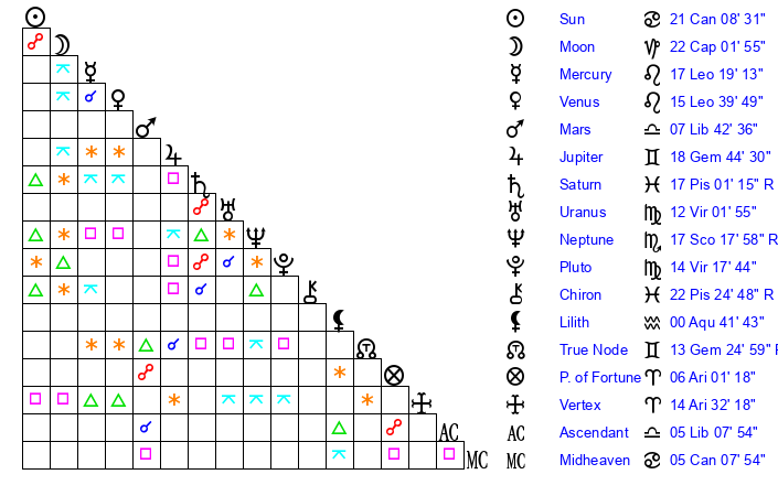 Moon | 21 Capricorn 59 | 27 Aquarius 22 | 28 Pisces 7 |