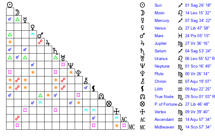 | Saturn | 5 Sagittarius 18 | 12 Pisces 41 | 12 Sagittarius 31 |