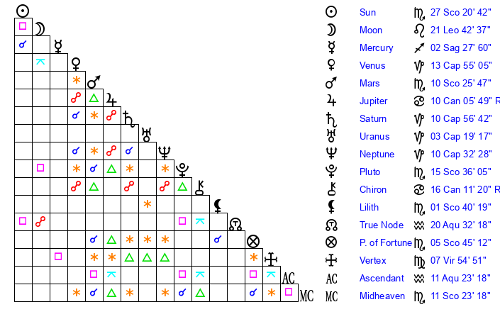 | Moon | 21 Leo 43 | 21 Scorpio 22 | 6 Sagittarius 14 |