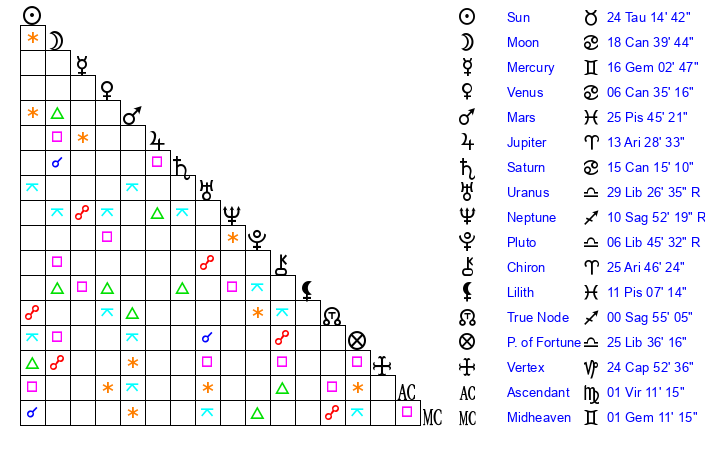 | Moon | 18 Cancer 45 | 28 Sagittarius 30 | 16 Taurus 0 |