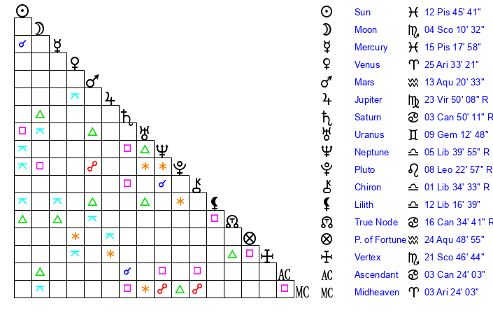 | Neptune | 5 Libra 40 | 28 Pisces 59 | 3 Libra 48 |