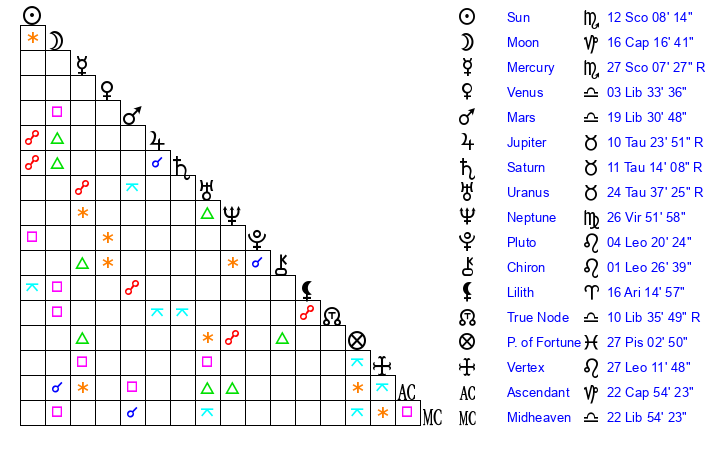 | Venus | 3 Libra 34 | 27 Libra 12 | 18 Capricorn 30 |
