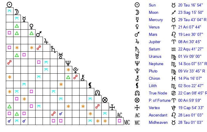 | Sun | 20 Taurus 17 | 21 Taurus 15 | 19 Cancer 37 |