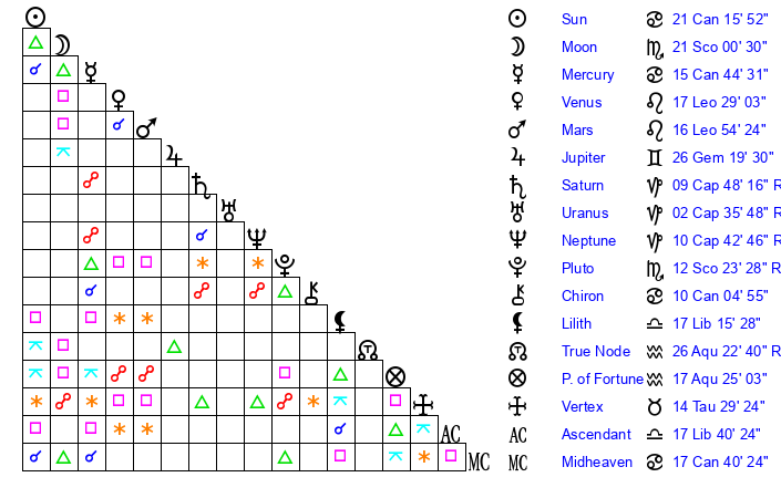 | Moon | 20 Scorpio 56 | 26 Aquarius 16 | 17 Pisces 3 |