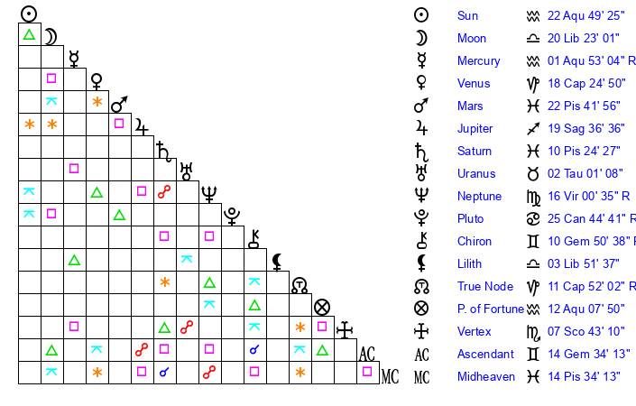 | Sun | 22 Aquarius 49 | 24 Aquarius 14 | 20 Taurus 48 |