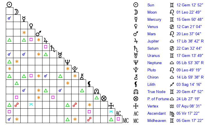 | Sun | 12 Gemini 13 | 13 Gemini 5 | 27 Leo 44 |