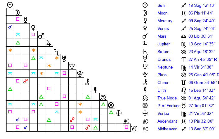 | Sun | 19 Sagittarius 42 | 20 Sagittarius 37 | 21 Pisces 54 |