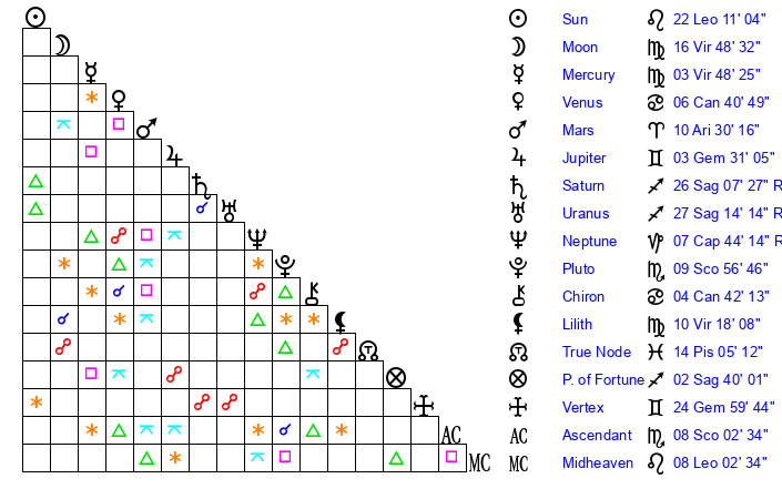 Moon | 16 Virgo 50 | 3 Taurus 13 | 18 Capricorn 56 |