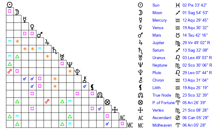 Sun | 2 Pisces 33 | 3 Pisces 4 | 9 Taurus 49 |