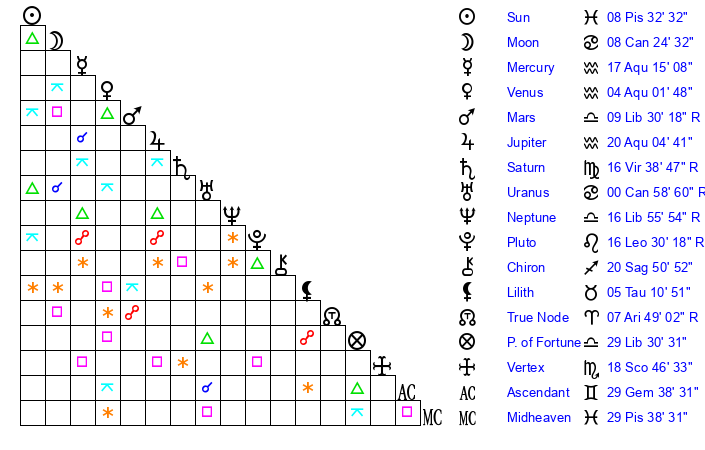 | Neptune | 16 Libra 55 | 28 Pisces 50 | 15 Libra 2 |