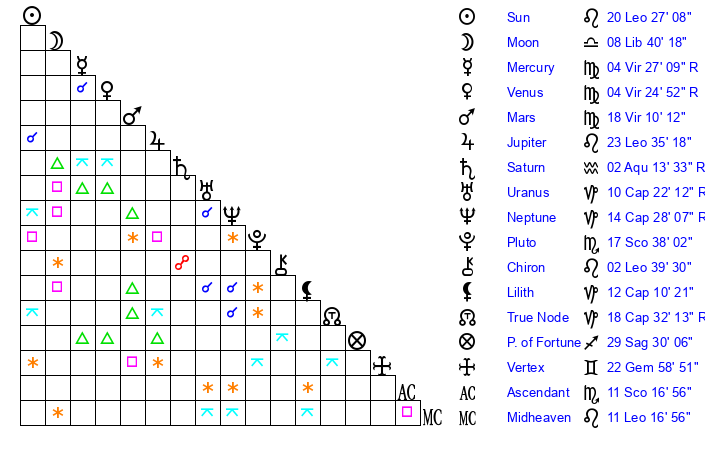 | Sun | 20 Leo 27 | 21 Leo 12 | 23 Virgo 19 |