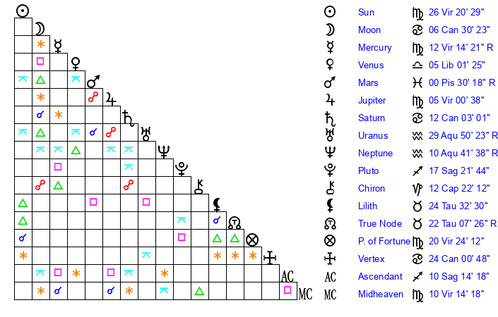 Sun | 26 Virgo 21 | 27 Virgo 0 | 17 Libra 58 |