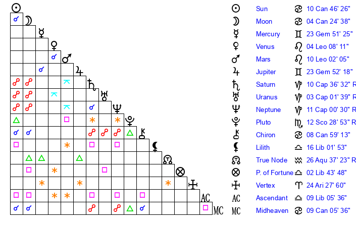 | Neptune | 10 Capricorn 59 | 2 Aries 10 | 10 Capricorn 5 |
