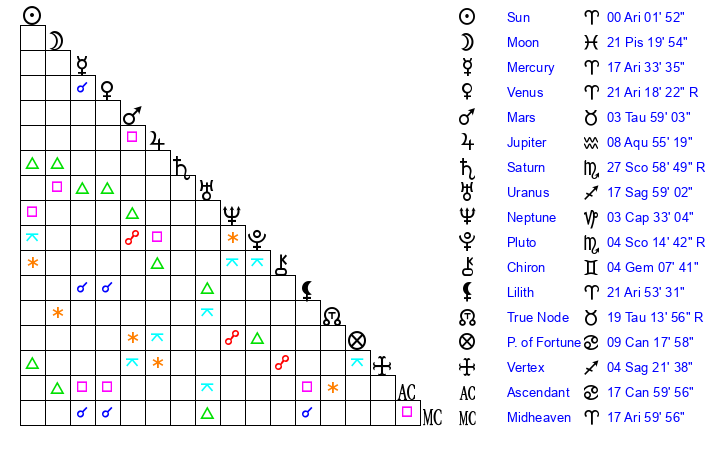 | Venus | 21 Aries 18 | 4 Aries 8 | 6 Aries 25 |