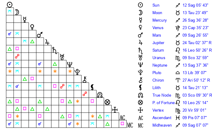 | Sun | 12 Sagittarius 5 | 12 Sagittarius 27 | 0 Aquarius 58 |
