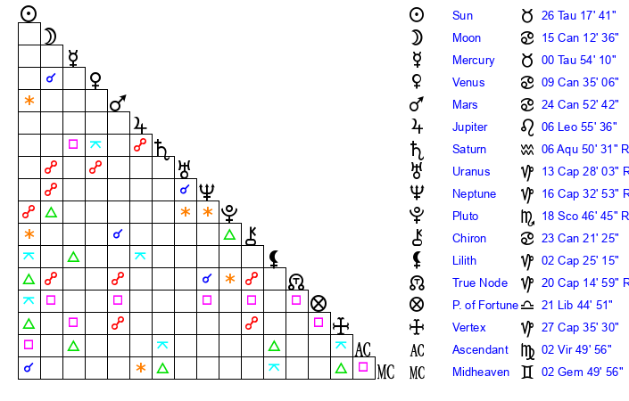 | Venus | 9 Cancer 35 | 12 Aries 2 | 14 Leo 3 |