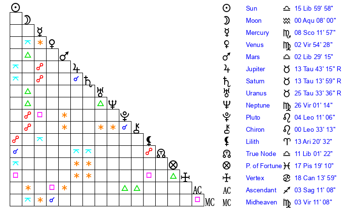 Sun | 16 Libra 0 | 16 Libra 39 | 10 Capricorn 40 |