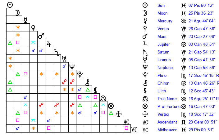 | Moon | 25 Pisces 34 | 20 Aquarius 31 | 16 Cancer 13 |