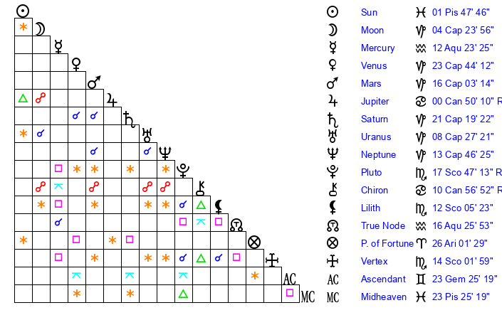 | Moon | 4 Capricorn 17 | 1 Sagittarius 51 | 19 Aries 3 |