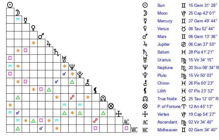 | Sun | 15 Gemini 32 | 16 Gemini 14 | 11 Leo 51 |