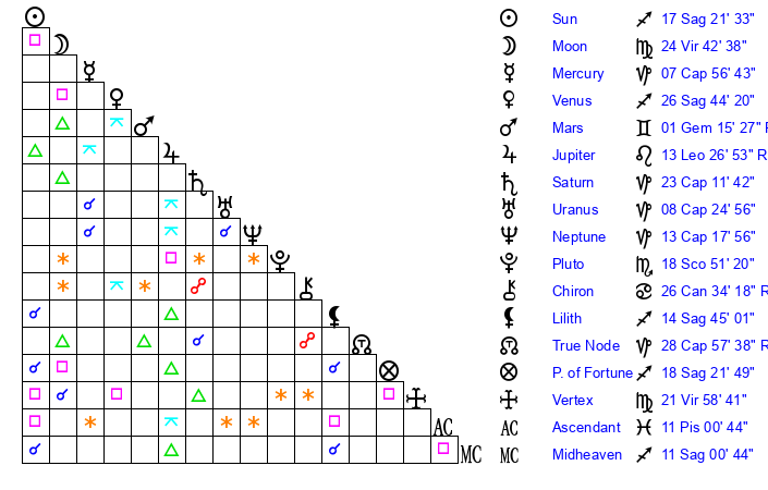 | Venus | 26 Sagittarius 45 | 11 Sagittarius 9 | 10 Aquarius 39 |