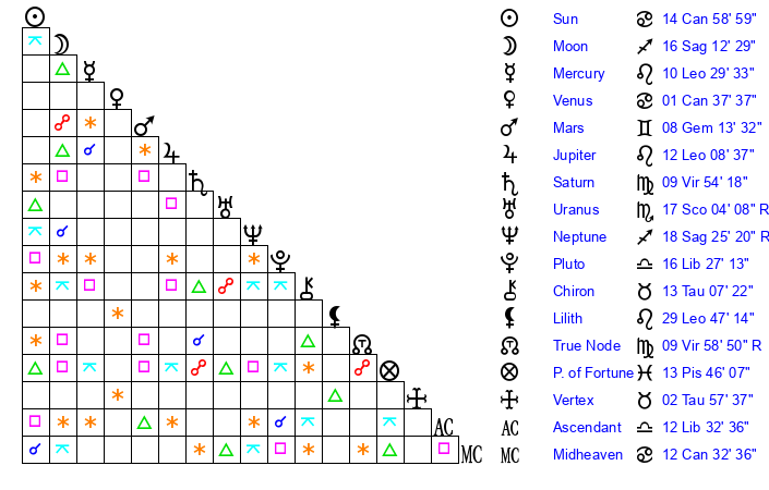| Neptune | 18 Sagittarius 25 | 2 Aries 10 | 17 Sagittarius 44 |