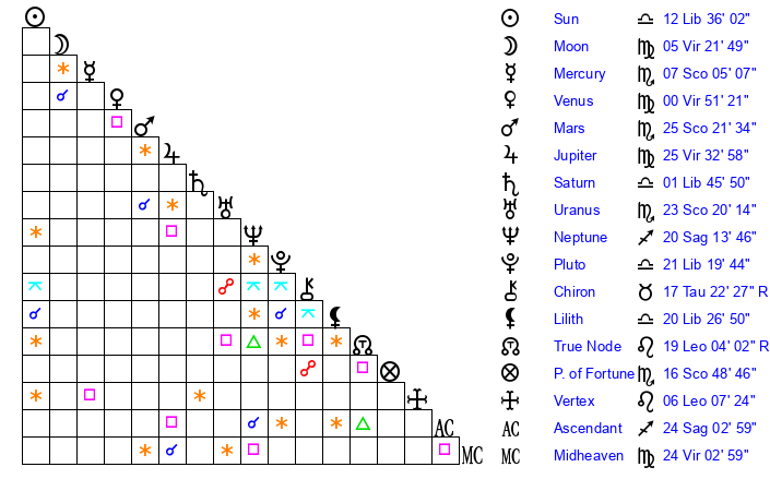 | Venus | 0 Virgo 52 | 19 Virgo 52 | 24 Libra 39 |