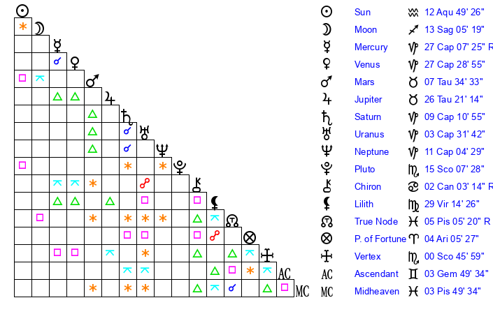 | Sun | 12 Aquarius 49 | 13 Aquarius 5 | 19 Pisces 6 |