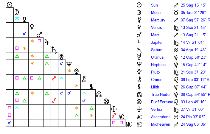 Sun | 25 Sagittarius 15 | 26 Sagittarius 15 | 28 Capricorn 52 |