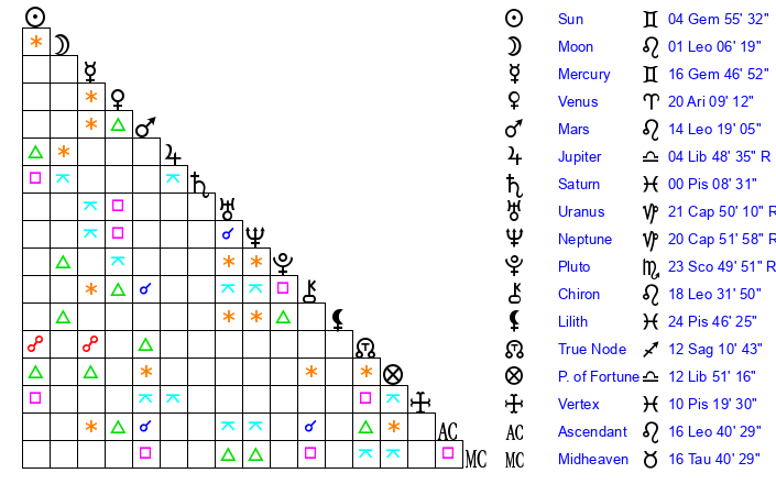 | Jupiter | 4 Libra 38 | 26 Gemini 42 | 5 Libra 36 |