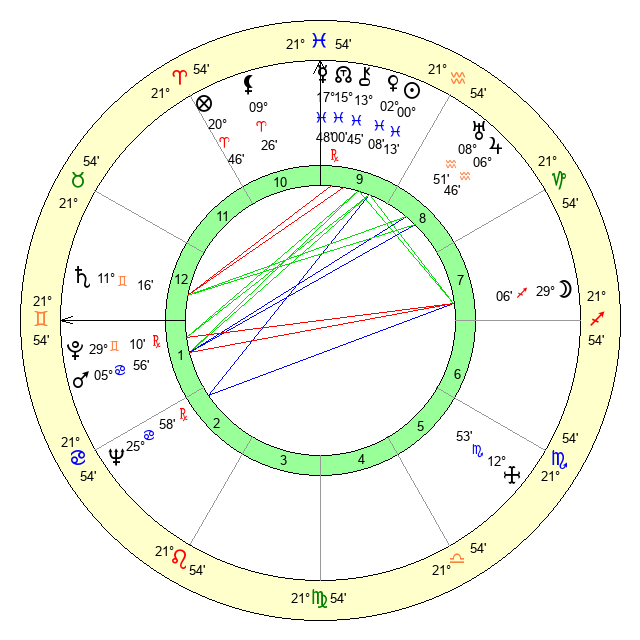 | Sun | 0 Pisces 13 | 1 Pisces 18 | 18 Gemini 56 |
