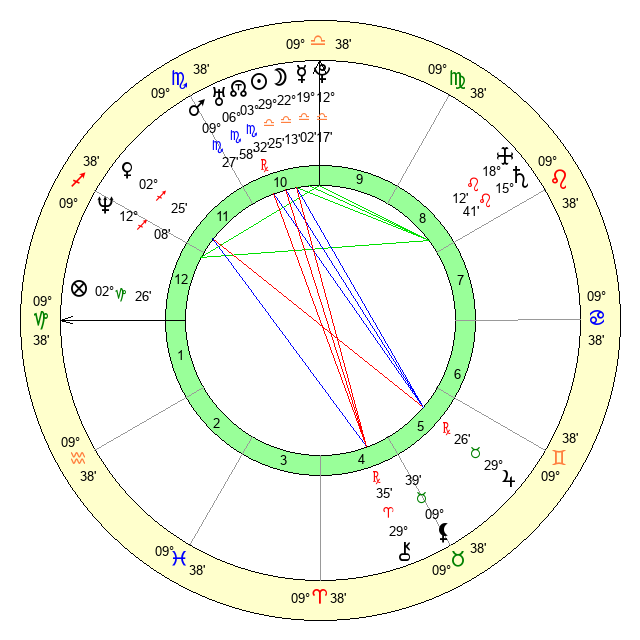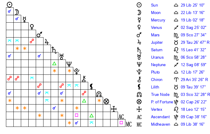 | Moon | 22 Libra 9 | 12 Scorpio 33 | 3 Leo 35 |