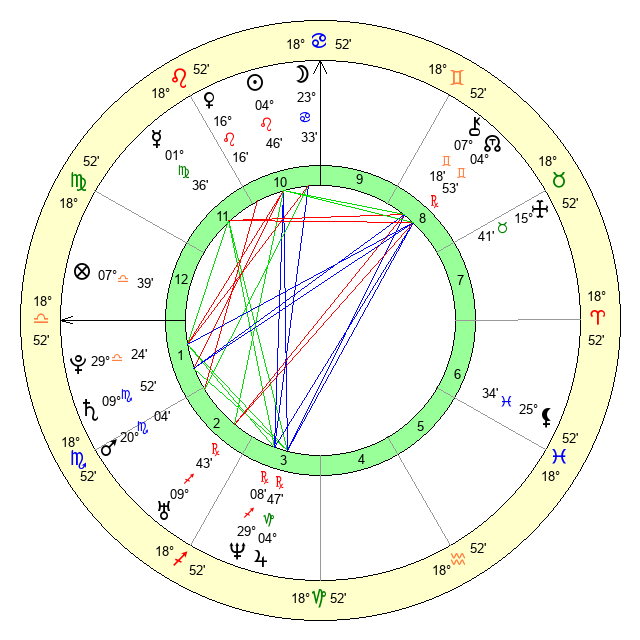 | Moon | 23 Cancer 33 | 10 Virgo 16 | 3 Aquarius 57 |
