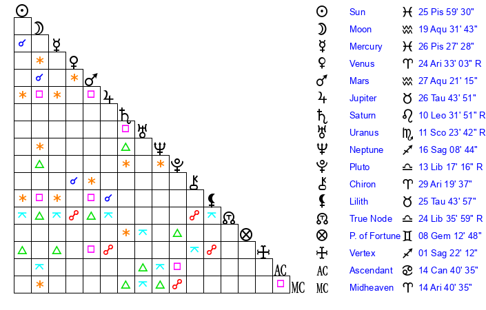 | Sun | 26 Pisces 0 | 26 Pisces 21 | 13 Taurus 8 |