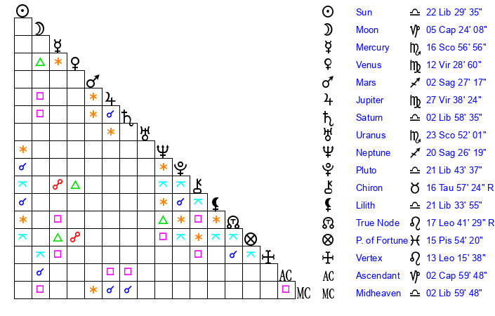 | Saturn | 3 Libra 20 | 26 Pisces 36 | 8 Libra 0 |