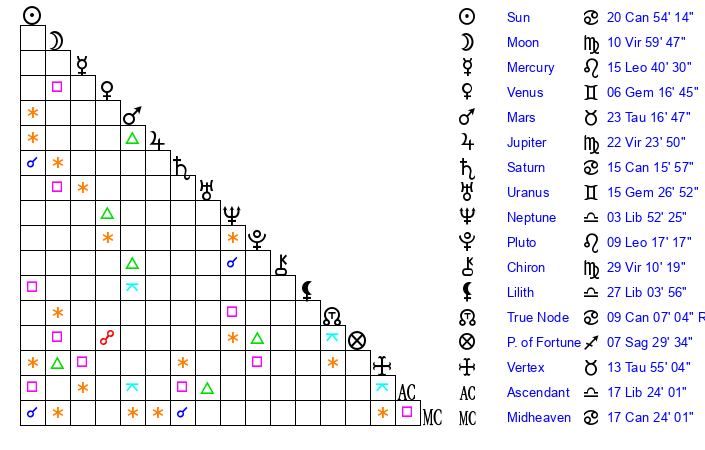 | Moon | 11 Virgo 5 | 26 Aquarius 16 | 17 Leo 4 |