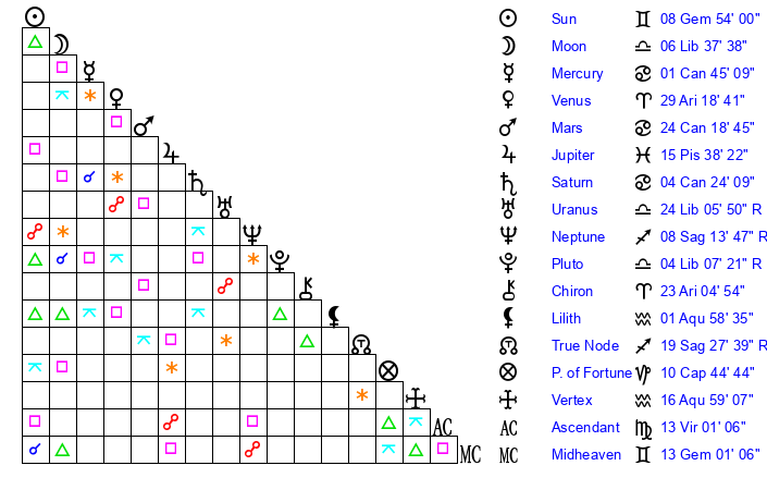| Pluto | 4 Libra 6 | 3 Aquarius 39 | 4 Libra 25 |