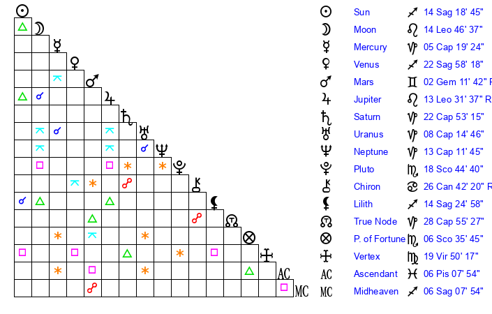| Venus | 22 Sagittarius 58 | 7 Sagittarius 23 | 6 Aquarius 53 |